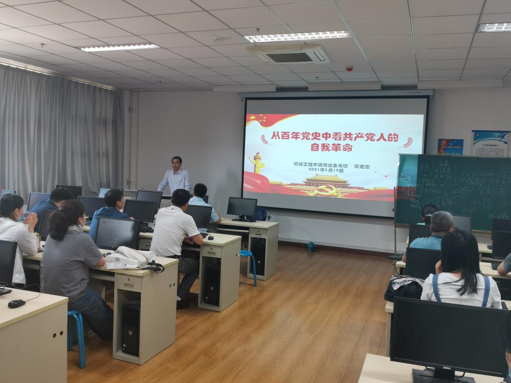 ,机械工程学院党总支书记苏宏志为全体党员讲授了一堂题为“从百年党史中看共产党人的自我革命”的生动党课。