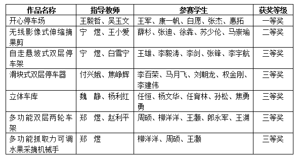 通过三轮的激烈评比,我院机械工程学院王毅哲、吴玉文老师指导机制1611班王军等同学制作的参赛作品《开心停车场》在众多高校参赛作品中脱颖而出,荣获一等奖。实现了我院在全国大学生机械创新设计大赛陕西赛区历史性突破,同时也是参加本次大赛中唯一获得一等奖的高职院校参赛队伍。最终我院参赛作品共获得一等奖一项、二等奖一项、三等奖五项的好成绩。