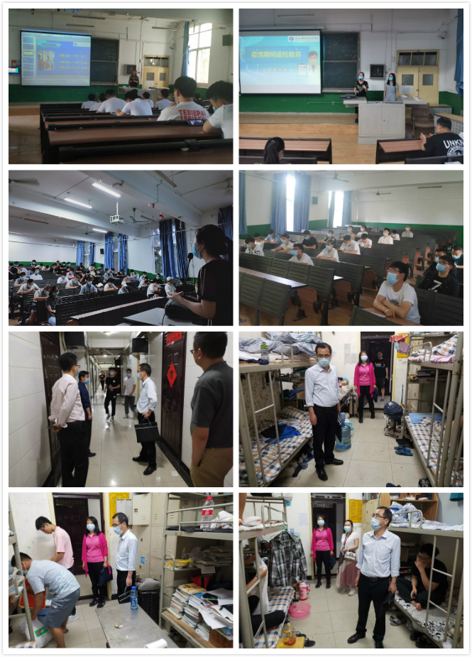 5月17日下午开始,2018级全体学生采取分批错峰及单双号原则召开新学期第一次班会,重点学习了疫情防控期间学校各项规章制度文件,对封校要求、晨午晚检制度、因病缺课登记跟踪制度、复课证明制度、宿舍卫生安全、应急情况处理等几个方面进行学习和强调;18日起,学院每天安排一名领导干部,带领辅导员和班主任深入学生自习室和宿舍进行检查,对晚自习缺勤和聚集情况及时核实和制止,对宿舍环境脏乱差等情况现场整顿,同时落实舍长、班长、班主任、学工办、二级学院各级责任,建立健全监督检查制度,保证学生健康和学业不受影响。