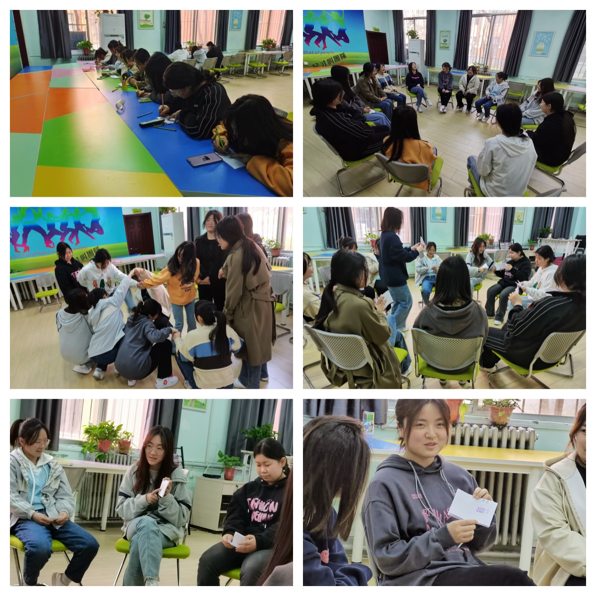 本次团训活动包括滚雪球、阿水的故事、心有千千结、小人书等,旨在通过游戏互动和相互分享环节,使同学们缓解近期学习生活压力,体验团体游戏带来的轻松感,释放学业、情绪、人际交往等压力,放松心身,自我成长,从而更好的了解学生心理健康,促进学生的全面发展。