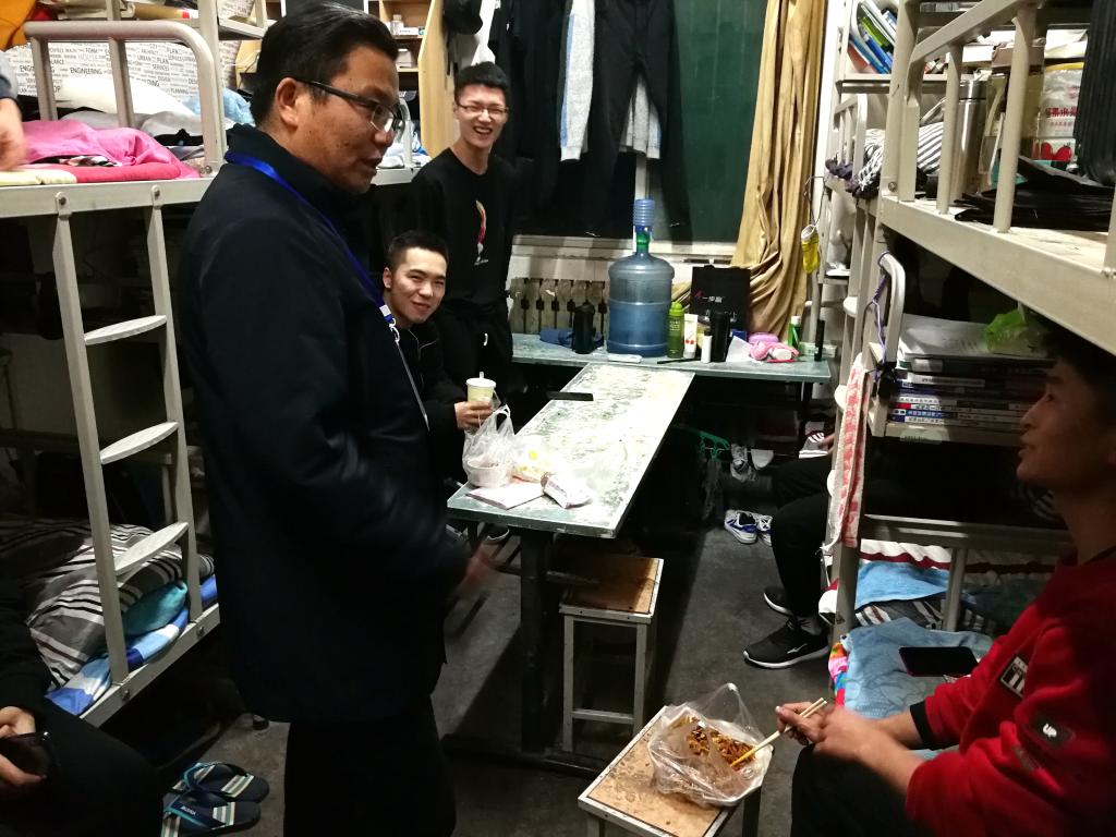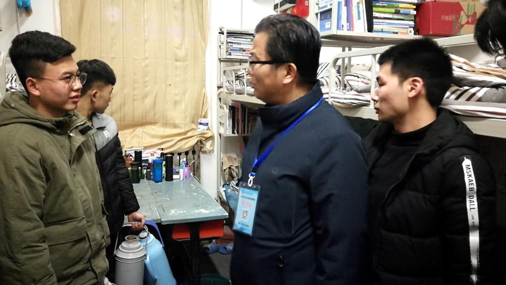 1月5日晚,机械工程学院党总支书记乌军锋带领学工办主任徐军纪、辅导员和学生干部深入学生公寓开展传染病防控和校园安全隐患排查工作。
