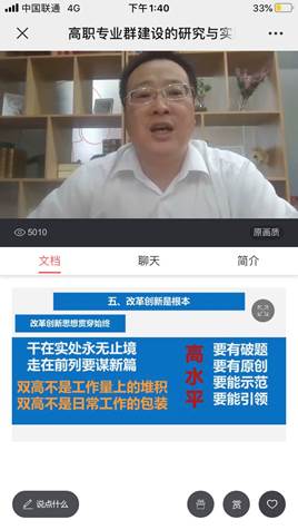 2019年中国特色高水平高职学校和专业建设计划(简称“双高计划”)经教育部、财政部审定并公示,陕西工业职业技术学院入选A10单位并开始建设,机械制造与自动化专业群、材料成型技术专业群为两个国家级重点建设专业群。2020年7月,我院机械制造与自动化专业群带头人赵明威教授受邀为新疆伊犁州教师素质提升专题项目作培训,培训内容分为人才培养方案及教师教学能力提升和机械制造与自动化专业群建设研究与实践两个专题报告。本次报告通过智慧树网络平台面向新疆伊犁州职业教育教师进行直播,赵明威教授报告期间5010人网上参与了我院专业群建设经验分享,学习人数为本次培训前列,培训效果受到一致好评,本次培训体现了我院作为双高建设院校发挥引领示范作用。