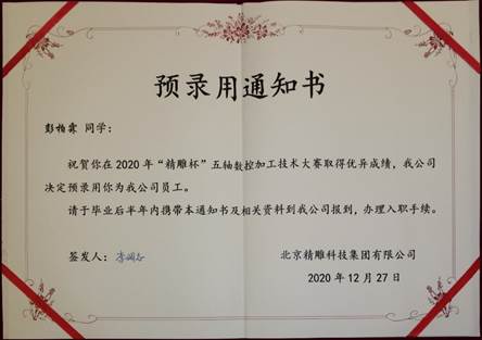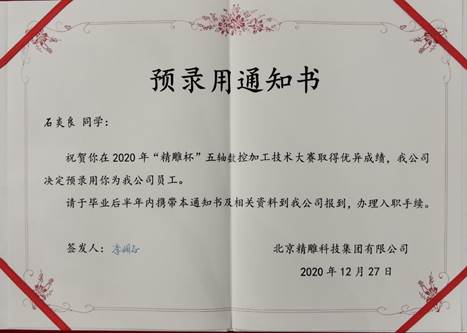 2020年12月24日—12月27日,全国机械行业职业技能大赛“精雕杯”五轴数控加工技能大赛在东莞市成功举办。本届大赛由机械工业教育发展中心、全国机械职业教育教学指导委员会主办,并由北京精雕科技集团有限公司承办,是一项全国性大赛。来自全国56支学生队伍参加了比赛。我校机械工程学院教师张景钰、张文帅指导的石炎良、彭柏霖两位同学,突破性地获得了全国二等奖的好成绩。两位同学在比赛中表现出色,直接获得了北京精雕科技集团有限公司的录用证书,在本次比赛中,机械工程学院克服疫情的不利影响,精心组织指导教师团队,在校领导统筹指导下、在教务处的大力支持下,开展培训与训练。