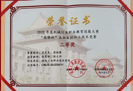 我院在机械行业职业技能大赛“精雕杯”五轴数控加工技能赛项中喜获二等奖
