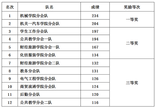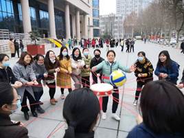此次活动共有16个分会500余名女教职工组成的18个代表队参加。队伍被分成三个小组,我院代表队排在第三小组第六个。虽天气较冷,老师们都抱着好学的心态积极总结其他队伍经验,为比赛能够取得好成绩出谋划策。21名女教职工中,推选樊爱珍老师为抛球手,腰系火红绸带,其他20名女教职工鼓手各持一绳,统一策略。最终在各位老师的齐心努力下,取得了234分第一名的好成绩!