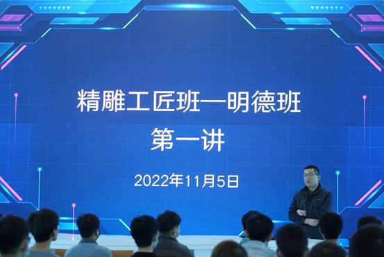2022年11月5日,第三期“精雕工匠班”在先进制造精雕产业学院数字化展厅举行了开班“第一讲”。此次活动由产业学院企业负责人王帅主持,机械工程学院院长赵明威、党总支书记苏宏志、副院长刘艳申校企双团队共同参加。开班第一讲首先由赵明威院长授课,他通过三点强调了制造行业对于中国的重要性,第一点说的是制造业是“立国之本、强国之基”的国家定位,第二点说的是在“精雕班”学习要有吃苦耐劳的精神,第三点说的是现阶段制造业人才需求呈现“多元化、复合型、创新性”三大特征;随后苏宏志书记以学生要做一个“明白的学生”为核心,督促学生要明白为什么要学、要学什么,要怎么学,学成后要干什么,期盼学生能学好技术、用好技术,层层“打关”,完成“精雕工匠班”的全部学习任务和考核任务,随后企业导师就“精雕工匠班”三年教学的安排以及教学过程中注意事项进行了介绍,重点强调了“精雕工匠班”着重培养高水平技术技能人才,拥有非常严格的淘汰机制,随后分组带领学生参观先进制造精雕产业学院,实景讲解现代化制造体系、先进制造设备和典型精密加工零件。