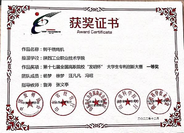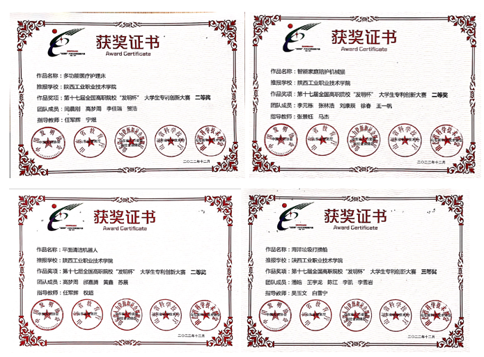 近日,我校领取了由中国发明协会、山东省教育厅、山东省人力资源和社会保障厅等六部门主办,中国发明协会高职发明创新分会、山东理工职业学院承办的第十七届全国高职院校“发明杯”大学生专利创新大赛获奖证书。大赛于2022年11月至12月举行,我院学生的6项参赛作品共获得一等奖1项、二等奖3项、三等奖1项,取得了历届参赛的最好成绩。