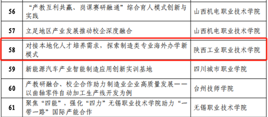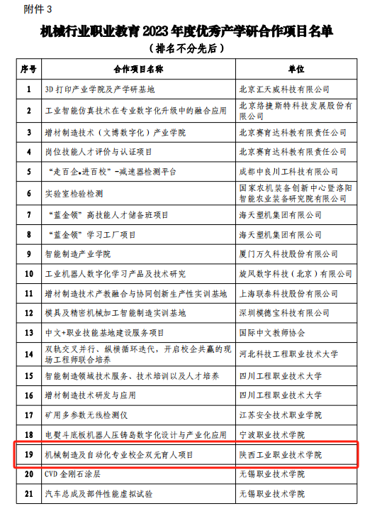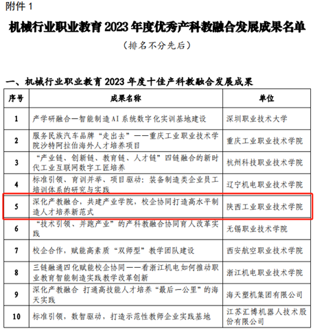 2024年3月27日,机械工业教育发展中心公布了2023年度产科教融合发展成果和产学研合作项目评选结果名单,全国职业院校和相关企业提交的产教融合成果、案例和项目共计219篇,经专家评审,机械工程学院报送的《深化产教融合,共建产业学院,校企协同打造高水平制造人才培养新范式》、《接本地化人才培养需求,探索制造类专业海外办学新模式》和《机械制造及自动化专业校企双元育人项目》分别被评为2023年度十佳产科教融合发展成果、2023年度优秀产科教融合发展成果和2023年度优秀产学研合作项目。