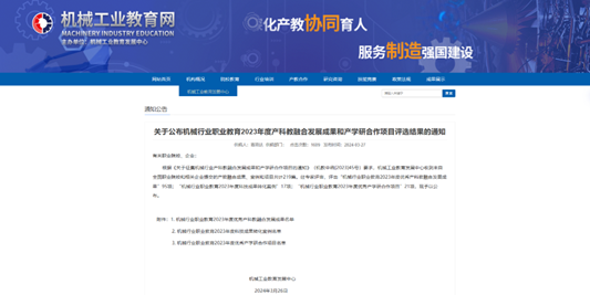 我校多项成果成功入选机械工业教育发展中心2023年度优秀产科教融合发展成果和优秀产学研合作项目