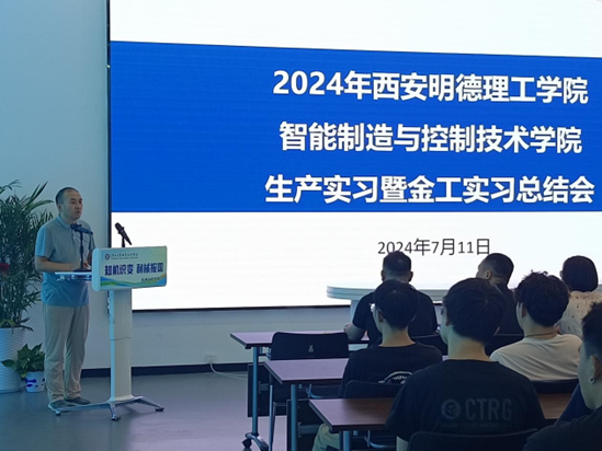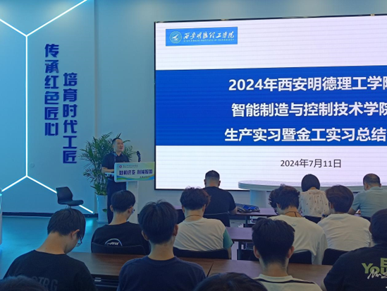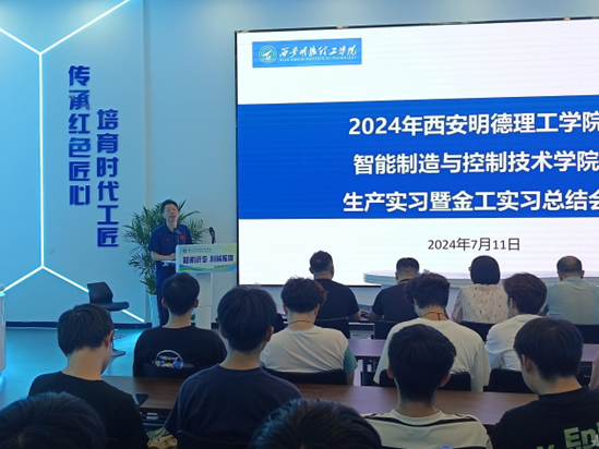 2024 年7月11日下午14:30,机械工程学院在先进制造技术工程中心展厅召开了西安明德理工学院智能制造与控制技术学院本科生金工实习与生产实习总结会。我校机械工程学院党总支书记侯涛、继续教育与培训学院副院长贾严鹏、西安明德理工学院智能制造与控制技术学院副书记曾凯、副院长李郁,以及培训班的管理人员、指导教师和优秀学员代表参加了本次会议。会议由先进制造精雕产业学院的企业负责人王帅主持。