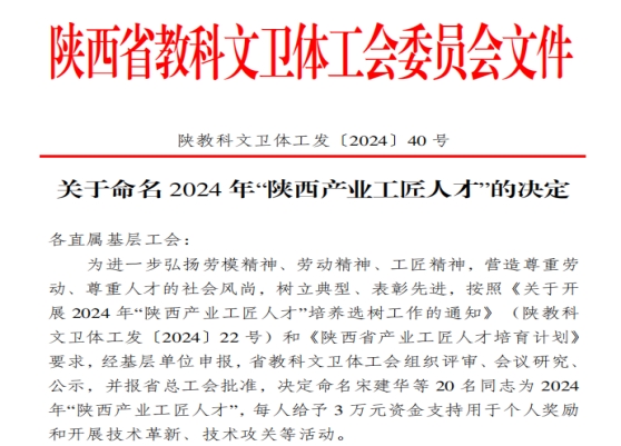 据悉,为进一步弘扬劳模精神、劳动精神、工匠精神,营造尊重劳动、尊重人才的社会风尚,树立典型、表彰先进,根据《陕西省教科文卫体工会委员会文件关于命名2024年“陕西产业工匠人才”的决定》(陕教科文卫体工发〔2024〕40号)文件,按照《关于开展2024年“陕西产业工匠人才”培养选树工作的通知》(陕教科文卫体工发〔2024〕22号)和《陕西省产业工匠人才培育计划》要求,本次活动共选出20名同志命名为2024年“陕西产业工匠人才”。