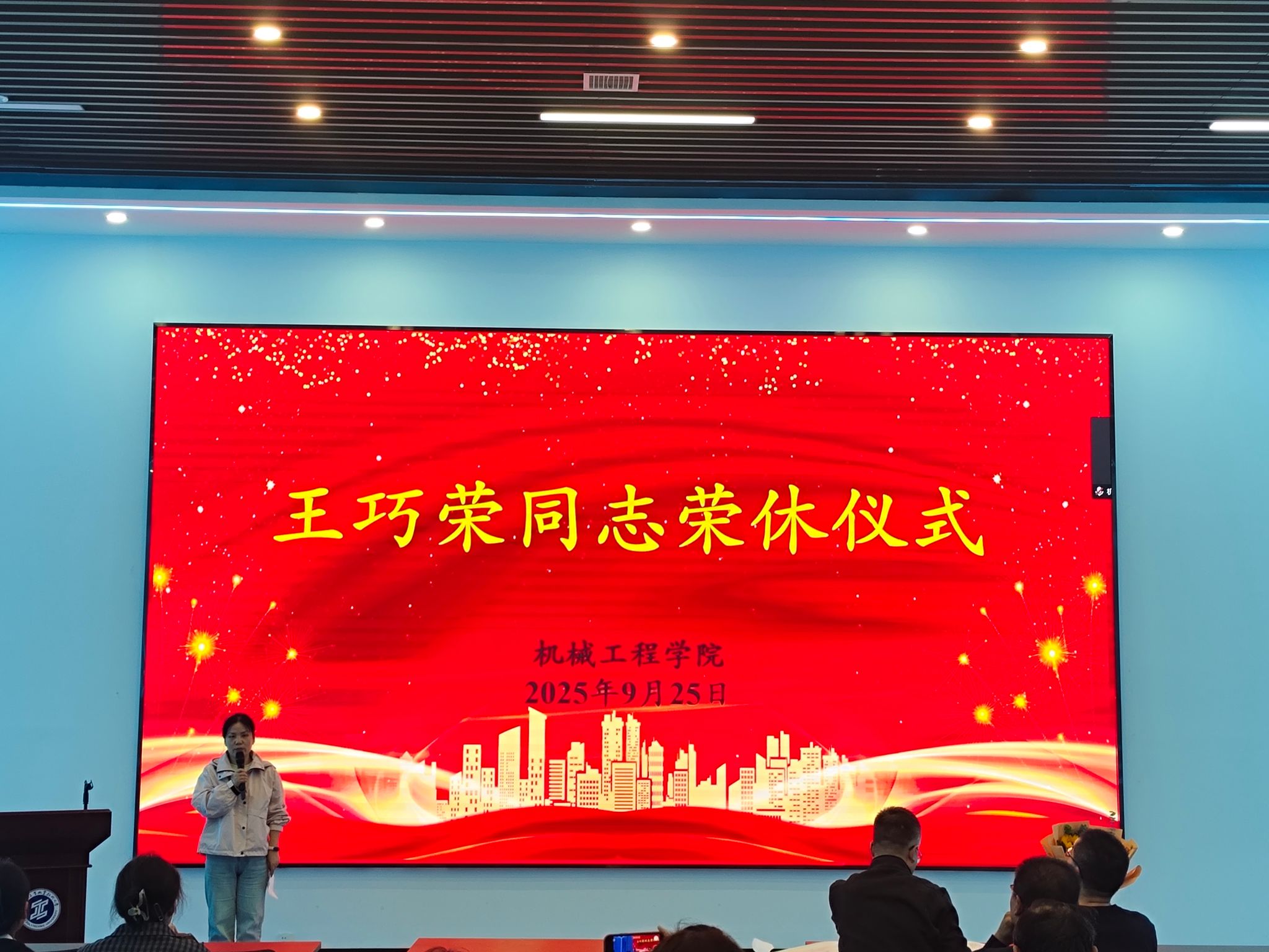 9月25日下午,机械工程学院在先进制造技术工程中心展厅为2025年下半年退休教师王巧荣老师举行温馨而隆重的荣休仪式。机械工程学院党总支书记侯涛、院长赵明威、副院长王建军及全体教职工齐聚一堂,向为学院发展辛勤奉献的王巧荣老师表达崇高的敬意和美好的祝福。