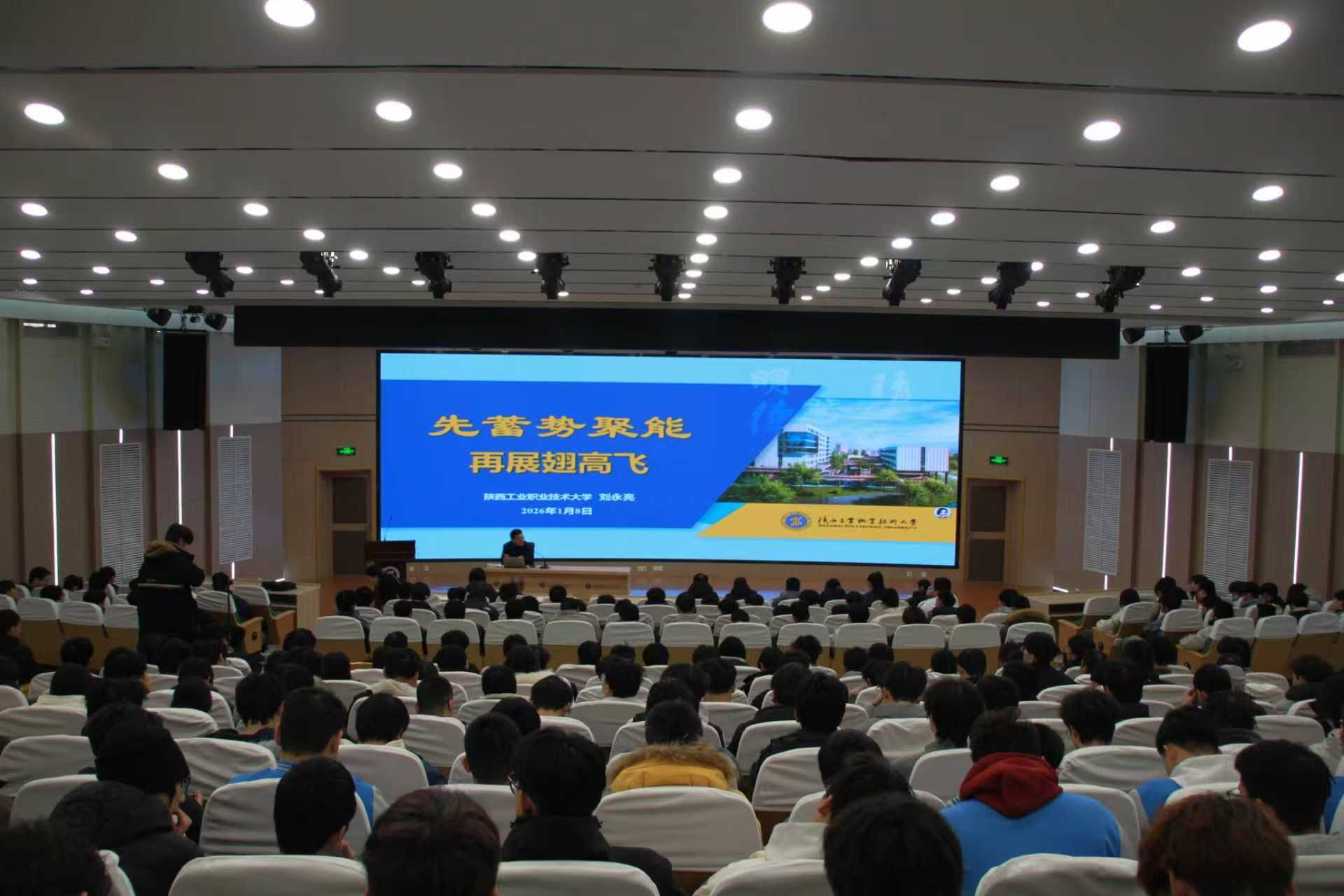 2026年1月8日,陕西工业职业技术大学校长刘永亮在学术会堂开展了一场主题为“先蓄势聚能,再展翅高飞”的职业规划讲座,讲座聚焦学生就业与成长关切问题,通过信念引领、责任唤醒、资源赋能、实操指导等方式,为在校生释疑解惑、明晰方向,助力学生勇敢迈向职场。本次讲座由机械工程学院党总支书记侯涛主持,机械工程学院全体辅导员,2024级、2025级480余名学生及就业处全体老师参加。