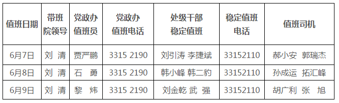 学院总值班室设在党政办公室。放假期间各部门值班时间:上午8:30-12:00,下午2:30-6:00。保卫处24小时值班电话:33152110。